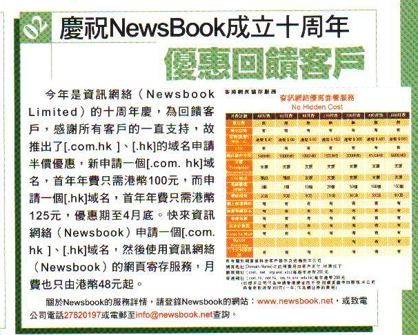 This year is the Newsbook Limited (Newsbook Limited) of the tenth anniversary. Thanks for all the customers support, apply for the introduction domain name [. Com.hk],[. Hk] is half-price concession. Apply the new domain names of [. Com. hk], the first year only costs HK$100, and apply for a [. hk] domain name, the first year costs just HK 125.The discount period is at the end of April. Come to Newsbook Limited (Newsbook) apply a [ . com.hk], or [. hk] domain name, then use the Newsbook Limited (Newsbook) web hosting services, a monthly fee only from HK$48.