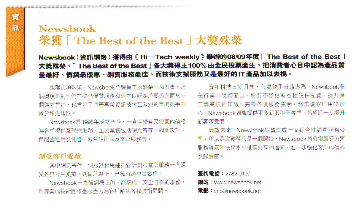 Newsbook won the award of 08/09 years of [Best of Best] which is hold by the <Hi- Tech weekly>. Winners of [The Best of Best] are 100% voted by citizen, who is the quality is the best, price is low, and service is great and the best of technical support services provider all believed by customers