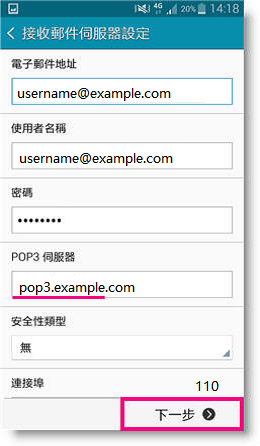 08 輸入POP3伺服器[POP3 server]和使用者名稱密碼,再按下一步[Next]