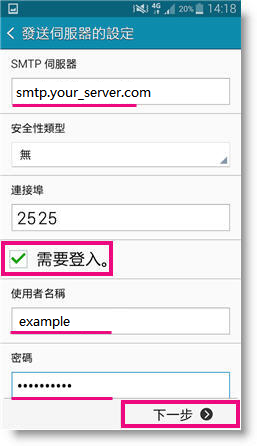 09 輸入SMTP 伺服器(smtp server), 勾選"必需登入[require sign-in]",再輸入使用者名稱及密碼再點選"下一步[Next]"