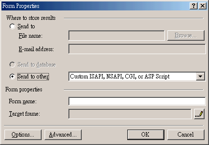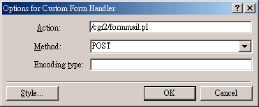 步驟二: 然後按下 "Options...",在圖二的 "Action:" 欄位改為 "/cgi2/formmail.pl" ,(在二000年九月二十日前申請的客戶,請使用 "/cgi-bin/formmail.pl" ),再按ok。