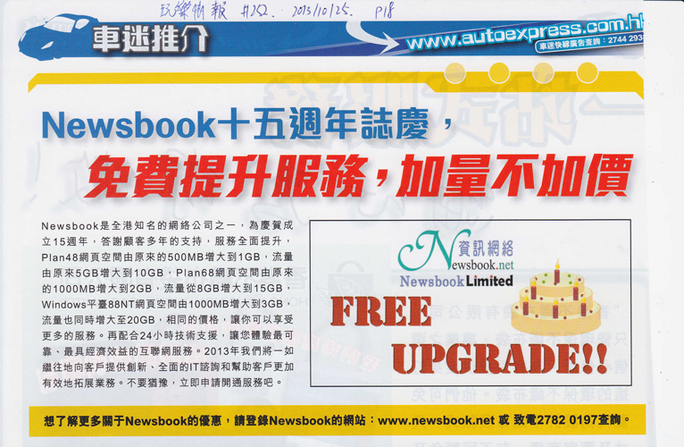 Newsbook十五週年誌慶,免費提升服務加量不加價Newsbook是全港知名的網絡公司之一,為慶賀成立15週年,答謝顧客多年的支持,服務全面提升,Plan48網頁空間由原來的500MB增大到1GB,流量由原來5GB增大到10GB,Plan68網頁空間由原來的1000MB增大到2GB,流量從8GB增大到15GB, Windows平台88NT網頁空間由1000MB增大到3GB,流量也同時增大至20GB,相同的價格,讓你可以享受更多的服務。再配合24 小時技術支援,讓您體驗最可靠、最具經濟效益的互聯網服務。 2013年我們將一如繼往地向客戶提供創新、全面的IT諮詢和幫助客戶更加有效地拓展業務。不要猶豫,立即申請開通服務吧。 想了解更多關於Newsbook的優惠,請登錄Newsbook的網站: www.newsbook.net或致電2782 0197查詢。