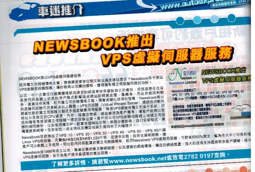 Newsbook目前推出了VPS 10、VPS 20、VPS 30、VPS 40、VPS 50、VPS 60六檔Linux VPS伺服器,月費由HK$238至HK$1,020不等,並提供安裝、技術支援等服務,讓客戶可以輕鬆上手使用。相比租用同等配置的獨立伺服器價格,租用Newsbook VPS虛擬伺服器,可節省約60%開支,實為各大中小站長的福音。