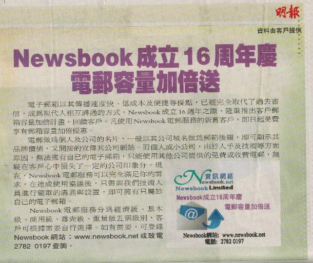 電子郵箱以其傳播速度快、低成本及便捷等優點,已經完全取代了過去書信,成為現代人相互溝通的方式。Newsbook成立16週年之際,隆重推出客戶郵箱容量加倍計畫,回饋客戶。凡使用Newsbook電郵服務的新老客戶,即日起免費享有郵箱容量加倍優惠。