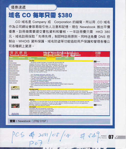 .CO域名是Company或Corporation的縮寫, 所以用.CO域名作為公司網址會容易吸引他人注意和記憶。現在Newsbook推出平價優惠, 註冊商需要提交書面資料和審核, 一年註冊費只需HKD 380元。域名註冊採取「先到先得」制即時註冊原則, 同時送免費DNS控制台、WHOIS資料保護、域名防盜等功能協助用戶保護和管理各種公司各種網上資源。