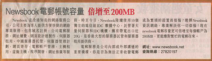 電郵服務是公司內部或外部溝通的重要橋樑。你是否為無法正常收發電郵或為繁瑣的設置而煩惱?選擇Newsbook資訊網絡,專業解決你一切煩惱!現在newsbook電郵容量更可倍增至每個帳戶為200MB,更能應對繁忙的電郵往來。你都快來申請吧!