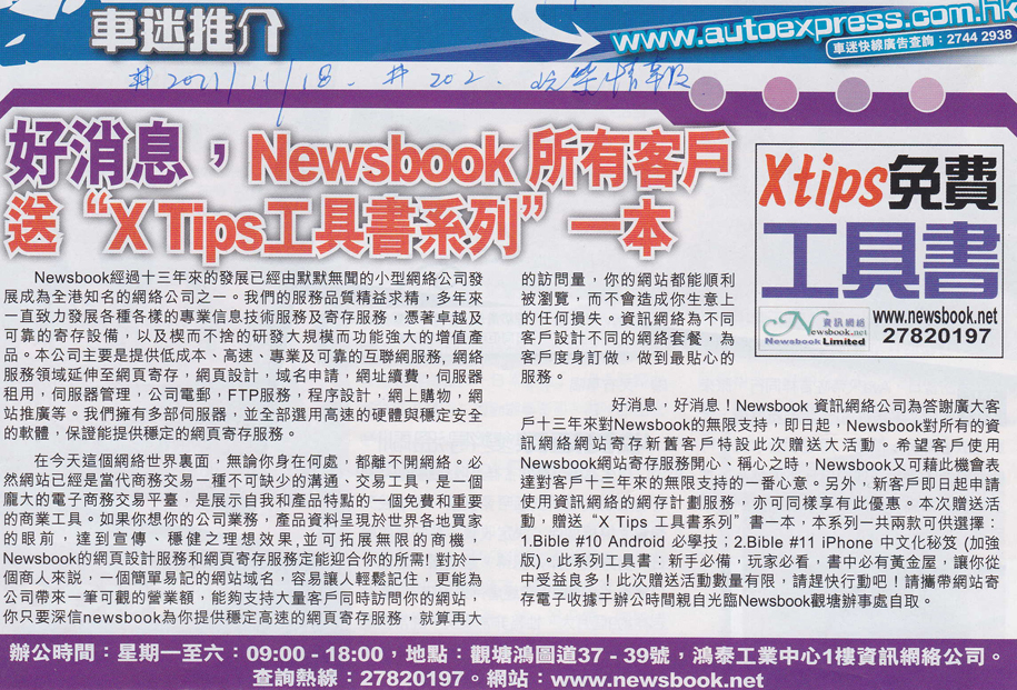 好消息,好消息!Newsbook 资讯网络公司为答谢广大客户十三年来对Newbook的无限支持,即日起,Newsbook对所有的资讯网络网站寄存新旧客户特设此次赠送大活动。希望客户使用Newbook网站寄存服务开心、称心之时,Newbook又可藉此机会表达对客户十三年来的无限支持的一番心意。另外,新客户即日起申请使用资讯网络的网存计划服务,亦可同样享有此优惠。本次赠送活动,赠送“X Tips 工具书系列”书一本,本系列一共两款可供选择:1.Bible #10 Android 必学技;2.Bible #11 iPhone 中文化秘笈 (加强版)。此系列工具书:新手必备,玩家必看,书中必有黄金屋,让你从中受益良多!此次赠送活动数量有限,请赶快行动吧!请携带网站寄存电子收据于办公时间亲自光临Newbook观塘办事处自取。