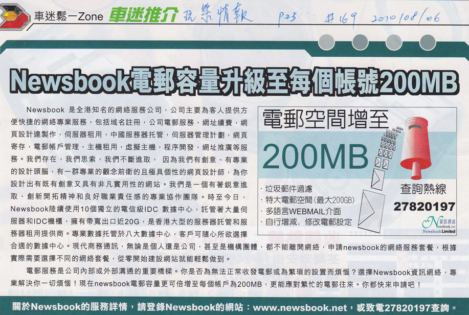 电邮服务是公司内部或外部沟通的重要桥梁? 你是否为无法正常收发电邮或为繁琐的设置而烦恼? 选择Newsbook资讯网络, 专业解决你一切烦恼! 现在newsbook 电邮容量更可倍增至每个帐户为200MB, 更能应对繁忙的电邮往来?