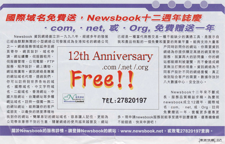 Newsbook十二年来不断成长, 服务品质精益求精?为庆祝newsbook成立12周年, 国际域名.com, .net, 或 .Org, 注册免费赠送一年, 套餐更多优惠更多?现申请newsbook服务就能享受周年志庆优惠, 优惠机会绝不可错过, 快来申请吧!