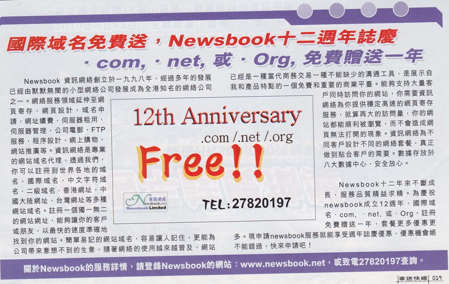 Newsbook十二年来不断成长, 服务品质精益求精?为庆祝newsbook成立12周年, 国际域名.com, .net, 或 .Org, 注册免费赠送一年, 套餐更多优惠更多?现申请newsbook服务就能享受周年志庆优惠, 优惠机会绝不可错过, 快来申请吧!