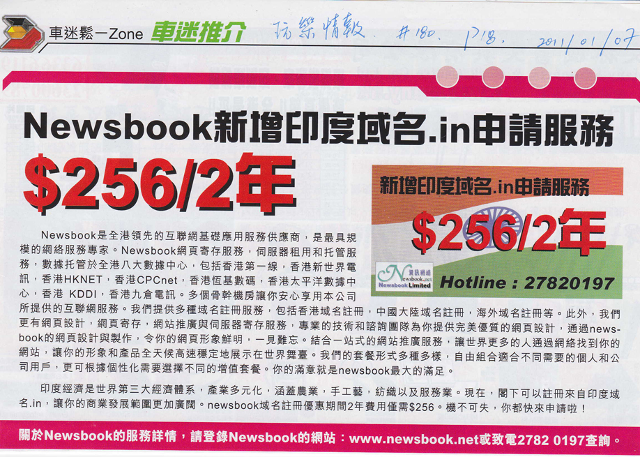 Newsbook是全港领先的互联网基础应用服务供应商,是最具规模的网络服务专家。Newsbook网页寄存服务,服务器租用和托管服务,数据托管于全港八大数据中心,包括香港第一线,香港新世界电讯,香港HKNET,香港CPCnet,香港恒基数码,香港太平洋数据中心,香港 KDDI, 香港九仓电讯,。多个骨干机房让你安心想用本公司所提供的互联网服务。我们提供多种域名注册服务,包括香港域名注册,中国大陆域名注册,海外域名注册等。此外,我们更有网页设计,网页寄存,网站推广与服务器寄存服务,专业的技术和谘询团队为你提供完美的优质网页设计,通过newsbook的网页设计与制作,令你的网页形象鲜明,一见难忘。结合一站式的网站推广服务,让世界更多的人通过网络找到你的网站,让你的形象和产品全天候高速稳定地展示在世界舞台。我们的套餐形式多种多样,自由组合适合不同需要的个人和公司用户,更可根据个性化需要选择不同的增值套餐。你的满意就是newsbook最大的满足。