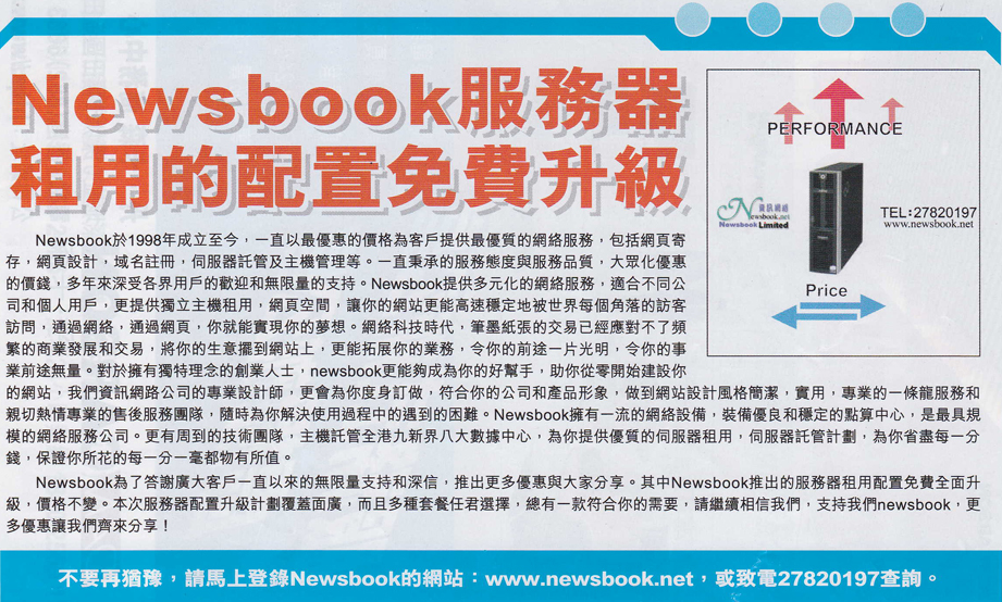 Newsbook于1998年成立至今,一直以最优惠的价格为客户提供最优质的网络服务,包括网页寄存,网页设计,域名注册,服务器托管及主机管理等。一直秉承的服务态度与服务品质,大众化优惠的价钱,多年来深受各界用户的欢迎和无限量的支持。Newsbook提供多元化的网络服务,适合不同公司和个人用户,更提供独立主机租用,网页空间,让你的网站更能高速稳定地被世界每个角落的访客访问,通过网络,通过网页,你就能实现你的梦想。网络科技时代,笔墨纸张的交易已经应对不了频繁的商业发展和交易,将你的生意摆到网站上,更能拓展你的业务,令你的前途一片光明,令你的事业前途无量。对于拥有独特理念的创业人士,newsbook更能够成为你的好帮手,助你从零开始建设你的网站,我们资讯网路公司的专业设计师,更会为你度身订做,符合你的公司和产品形象,做到网站设计风格简洁,实用,专业的一条龙服务和亲切热情专业的售后服务团队,随时为你解决使用过程中的遇到的困难。Newsbook拥有一流的网络设备,装备优良和稳定的点算中心,是最具规模的网络服务公司。更有周到的技术团队,主机托管全港九新界八大数据中心,为你提供优质的服务器租用,服务器托管计划, 为你省尽每一分钱,保证你所花的每一分一毫都物有所值。