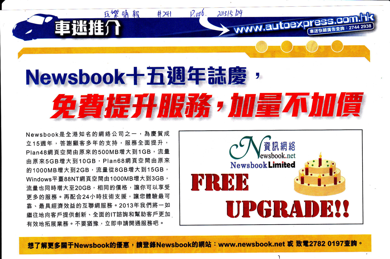 Newsbook十五週年志庆,免费提升服务,加量不加价 Newsbook是全港知名的网络公司之一,为庆贺成立15週年,答谢顾客多年的支持,服务全面提升,Plan48网页空间由原来的500MB增大到1GB,流量由原来5GB增大到10GB,Plan68网页空间由原来的1000MB增大到2GB,流量从8GB增大到15GB, Windows平台88NT网页空间由1000MB增大到3GB,流量也同时增大至20GB,相同的价格,让你可以享受更多的服务。再配合 24 小时技术支援,让您体验最可靠、最具经济效益的互联网服务。2013年我们将一如继往地向客户提供创新、全面的IT谘询和帮助客户更加有效地拓展业务。不要犹豫,立即申请开通服务吧。