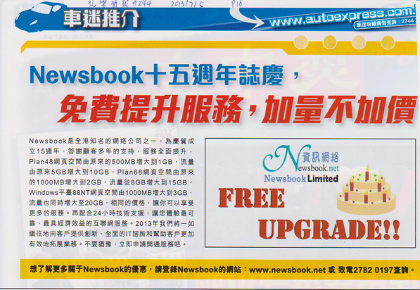 Newsbook十五週年志庆,免费提升服务,加量不加价 Newsbook是全港知名的网络公司之一,为庆贺成立15週年,答谢顾客多年的支持,服务全面提升,Plan48网页空间由原来的500MB增大到1GB,流量由原来5GB增大到10GB,Plan68网页空间由原来的1000MB增大到2GB,流量从8GB增大到15GB, Windows平台88NT网页空间由1000MB增大到3GB,流量也同时增大至20GB,相同的价格,让你可以享受更多的服务。再配合 24 小时技术支援,让您体验最可靠、最具经济效益的互联网服务。2013年我们将一如继往地向客户提供创新、全面的IT谘询和帮助客户更加有效地拓展业务。不要犹豫,立即申请开通服务吧。