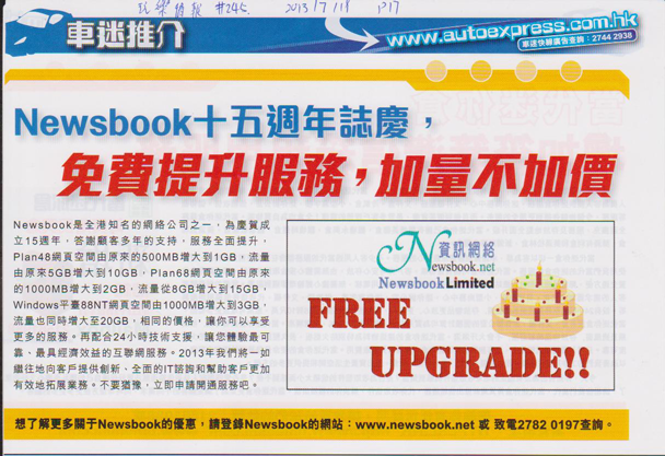 Newsbook十五週年志庆,免费提升服务,加量不加价 Newsbook是全港知名的网络公司之一,为庆贺成立15週年,答谢顾客多年的支持,服务全面提升,Plan48网页空间由原来的500MB增大到1GB,流量由原来5GB增大到10GB,Plan68网页空间由原来的1000MB增大到2GB,流量从8GB增大到15GB, Windows平台88NT网页空间由1000MB增大到3GB,流量也同时增大至20GB,相同的价格,让你可以享受更多的服务。再配合 24 小时技术支援,让您体验最可靠、最具经济效益的互联网服务。2013年我们将一如继往地向客户提供创新、全面的IT谘询和帮助客户更加有效地拓展业务。不要犹豫,立即申请开通服务吧。