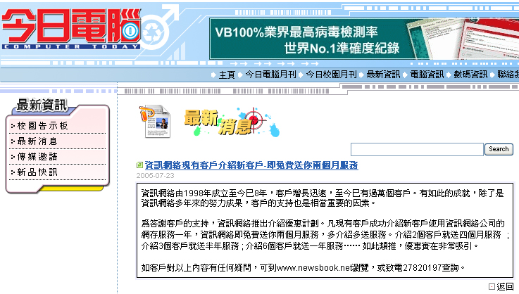 资讯网络由 1998 年成立至今巳8年,客户增长迅速,至今巳有过万个客户。有如此的成就,除了是资讯网络多年来的努力成果,客户的支持也是相当重要的因素。