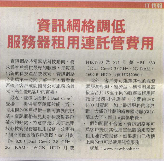 资讯网络是香港最大的网页储存,网页寄存,服务器托管,服务器租用,网页设计公司 资讯网络(Newsbook)是香港最具规模的网页储存商,提供稳定可靠的网页寄存及电邮服务,适合香港,中国及其他地区客户。