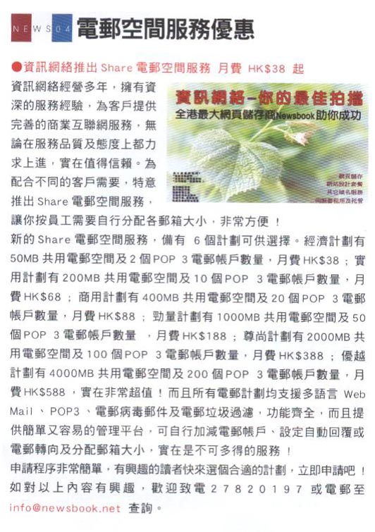 新的Share电邮空间服务,备有 6个计划可供选择。经济计划有50MB共用电邮空间及2个POP 3电邮帐户数量,月费HK$38 ; 实用计划有200MB共用电邮空间及10个POP 3电邮帐户数量,月费HK$68 ; 商用计划有400MB共用电邮空间及20个POP 3电邮帐户数量,月费HK$88 ; 劲量计划有1000MB共用电邮空间及50个POP 3电邮帐户数量 ,月费HK$188 ; 尊尚计划有2000MB共用电邮空间及100个POP 3电邮帐户数量,月费HK$388 ; 优越计划有4000MB共用电邮空间及200个POP 3电邮帐户数量,月费HK$588,实在非常超值 ! 而且所有电邮计划均支援多语言 Web Mail、POP3、电邮病毒邮件及电邮垃圾过滤,功能齐全,而且提供简单又容易的管理平台,可自行加减电邮帐户、设定自动回覆或电邮转向及分配邮箱大小,实在是不可多得的服务 !