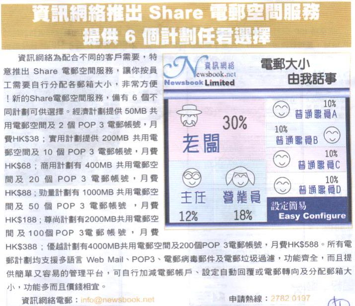新的Share电邮空间服务,备有 6个计划可供选择。经济计划有50MB共用电邮空间及2个POP 3电邮帐户数量,月费HK$38 ; 实用计划有200MB共用电邮空间及10个POP 3电邮帐户数量,月费HK$68 ; 商用计划有400MB共用电邮空间及20个POP 3电邮帐户数量,月费HK$88 ; 劲量计划有1000MB共用电邮空间及50个POP 3电邮帐户数量 ,月费HK$188 ; 尊尚计划有2000MB共用电邮空间及100个POP 3电邮帐户数量,月费HK$388 ; 优越计划有4000MB共用电邮空间及200个POP 3电邮帐户数量,月费HK$588,实在非常超值 ! 而且所有电邮计划均支援多语言 Web Mail、POP3、电邮病毒邮件及电邮垃圾过滤,功能齐全,而且提供简单又容易的管理平台,可自行加减电邮帐户、设定自动回覆或电邮转向及分配邮箱大小,实在是不可多得的服务 !