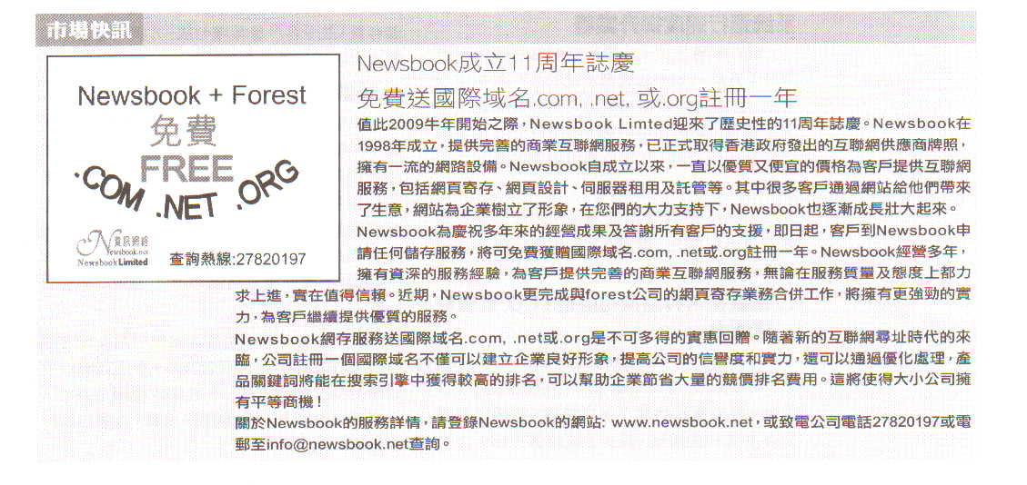 值此2009牛年开始之际Newsbook Limted迎来了历史性的十一周年志庆。 Newsbook1998年成立,提供完善的商业互联网服务,已正式取得香港政府发出的互联网供应商牌照,拥有一流的网路设备。Newsbook自成立以来,一直以优质又便宜的价格为客户提供互联网服务,包括网页寄存、网页设计、服务器租用及托管等。其中很多客户通过网站给他们带来了生意,网站为企业树立了形象,在您们的大力支持下,Newsbook也逐渐成长壮大起来。