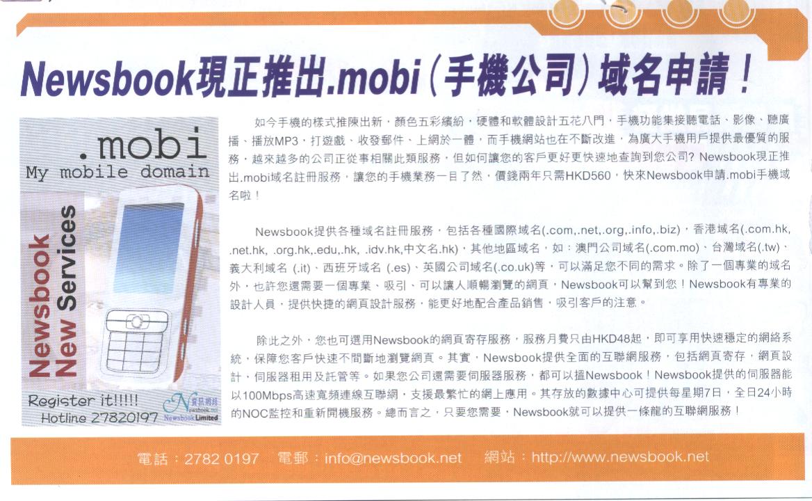 如今手机的样式推陈出新,颜色五彩缤纷,硬体和软体设计五花八门,手机功能集接听电话、影像、听广播、播放MP3,打游戏、收发邮件、上网于一体,而手机网站也在不断改进,为广大手机用户提供最优质的服务,越来越多的公司正从事相关此类服务,但如何让您的客户更好更快速地查询到您公司? Newsbook现正推出.mobi域名注册服务,让您的手机业务一目了然,价钱两年只需HKD560, 快来Newsbook申请.mobi手机域名啦!