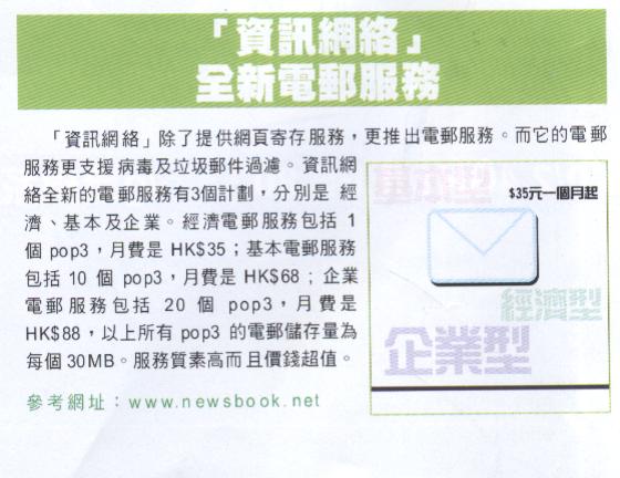 资讯网络公司在1998年成立,拥有资深的服务经验,提供稳定又高速的网存及电邮服务。在电邮服务上,资讯网络巳引入了病毒及垃圾邮件过滤服务,助你更专心处理业务。资讯网络的电邮服务有3个计划给客户选择 : 经济、基本及企业,经济电邮服务包括 1 个 pop3,月费是 HK$35;基本电邮服务包括 10 个 pop3,月费是 HK$68 ; 企业电邮服务包括 20 个 pop3,月费是 HK$88,以上所有 pop3 的电邮储存量为每个 30MB。服务质素高而且价钱十分超值,还不立即申请吧 !