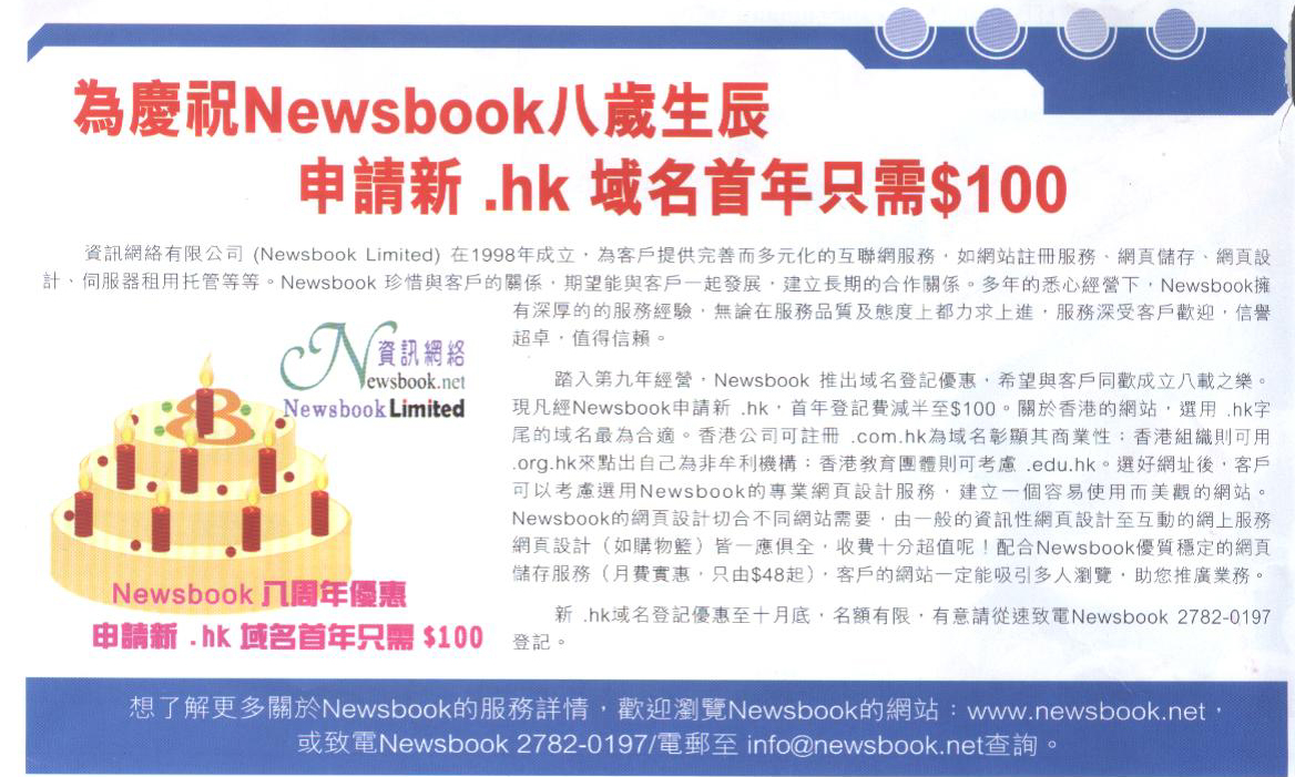 踏入第九年经营,Newsbook 推出域名登记优惠,希望与客户同欢成立八载之乐。现凡经Newsbook申请新 .hk,首年登记费减半至 $100。关于香港的网站,选用 .hk字尾的域名最为合适。香港公司可注册 .com.hk为域名彰显其商业性;香港组织则可用 .org.hk来点出自己为非牟利机构;香港教育团体则可考虑 .edu.hk。选好网址后,客户可以考虑选用Newsbook的专业网页设计服务,建立一个容易使用而美观的网站。Newsbook的网页设计切合不同网站需要,由一般的资讯性网页设计至互动的网上服务网页设计 (如购物篮) 皆一应俱全,收费十分超值呢!配合Newsbook优质稳定的网页储存服务 (月费实惠,只由$48起),客户的网站一定能吸引多人浏览,助您推广业务。