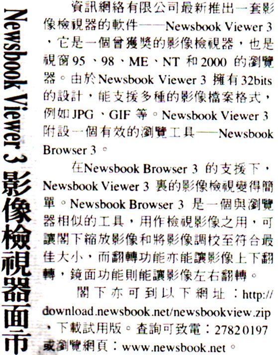 Newsbook Viewer 3影像监视器面市 信息网络有限公司最新推出一套影像监视器的软件――Newsbook Viewer 3,它是一个曾获奖的影像监视器,也是窗口95、98、ME、NT和2000的浏览器。由于Newsbook Viewer 32bits的设计,能支持多种的影像档案格式,例如JPG、GIF等。Newsbook Viewer 3附设一个有效的浏览工具――Newsbook Browser3。 在Newsbook Browser 3的支持下,Newsbook Browser 3里的影响监视器变得简单……