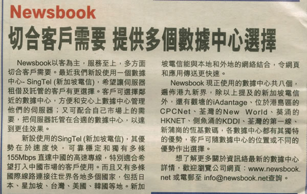 Newsbook切合客户需要 提供多个数据中心选择