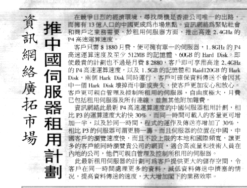 信息网络广拓市场 推中国服务器租用计划 在竞争日烈的经济环境,寻找商机是香港公司唯一的出路,而拥有13亿人口的中国更成为市场焦点。信息网络为紧贴社会和商户之业务需要,于租用服务器方面,推出高速2.4GHz的P4高速运算速度。 客户只需$1880月费,便可拥有单一的服务器,1.8GHz的P4高速运算速度及至少512MB 的内存、60GB的Hard Disk。即使最贵的计划也不过是月费$2880,客户即可想用高达2.4GHz的P4高速运算速度,以及1.5GB的内存和Raid120GB的Hard Disk,两个Hard Disk同时运行,客户可确保数据传送不会因其中一个Hard Disk坏掉而中断或上市,使客户更加安心和放心……