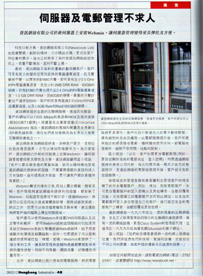 服务器及电邮管理不求人 资讯网络有限公司于新服务器上安装Webmin,让服务器管理变得更具弹性及方便。 科技日新月异,资讯网络有限公司(Newsbook Ltd)也抱着变通,创新的精神,力求精益求精,更切合客户和社会的需求。这也正好解答了为什么资讯网络能逆市而上,客量不断增加,盈利不断上扬。 最近,资讯网络又有新的优惠计划回馈客户。客户可享有更大的储存空间和更快的电脑运算速度,但月费维持不变,以原来的$1680月费,即可享有……