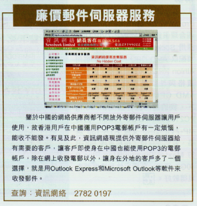 鉴于中国的网络供应商都不开放外寄服务器让用户使用,故香港用户在中国运用POP3电邮帐户有一定烦恼,能收不能发。有见及此,资讯网络现提供外寄邮件服务器给有需要的客户,让客户及时生仔中国也能使用POP3的电邮帐户,除在网上手法电邮意外,让生仔外地的客户多了一个选择,就是用Outlook Express和Microsoft Outlook等软件来收发软件。