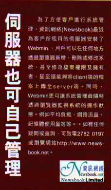 服务器也可自己管理 为了方便客户进行系统管理,信息网络(Newsbook)最近为客户所租用的服务器安装了Webmin,用户可以再任何地方透过浏览器新增、删除或修改系统,甚至档案权限及拥有者,甚至还能够将client端的档案上传至server端。同时,Webmin更可让系统管理员随时透过浏览器将是系统的运作状态。例如平均负载、网络流量、内存使用量等等。。如有认可疑问或查询,可致电2782 0197或浏览网站http://www.newsbook.net。