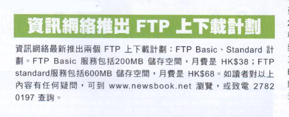继上星期资讯网络推出电邮计划优惠后,资讯网络最近新推出 FTP Basic、standard 计划,专为经常要上存下载较大档案及只须要网页又不须电邮服务的客户而设,完全体贴客户的不同需要。