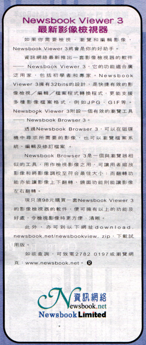 Newsbook Viewer 3 如果你需要检视、浏览和编辑图像,Newsbook Viewer 3将会是你的好助手。 信息网络最新推出一套影像监视器的软件――Newsbook Viewer 3,它的功能适合广泛用家,包括初学者和专家。Newsbook Viewer 3拥有32bits的设计,是快捷有效的影像检视/编辑/档案程序转换 程序,更能资源多种影像档案格式,包括JPG、GIF等。Newsbook Viewer 3辐射一个有效的浏览工具――Newsbook Browser 3。 透过Newsbook Browser 3,可以在磁盘驱动器中寻求所需要的影像,也可以浏览档案系统、编辑及修订档案……