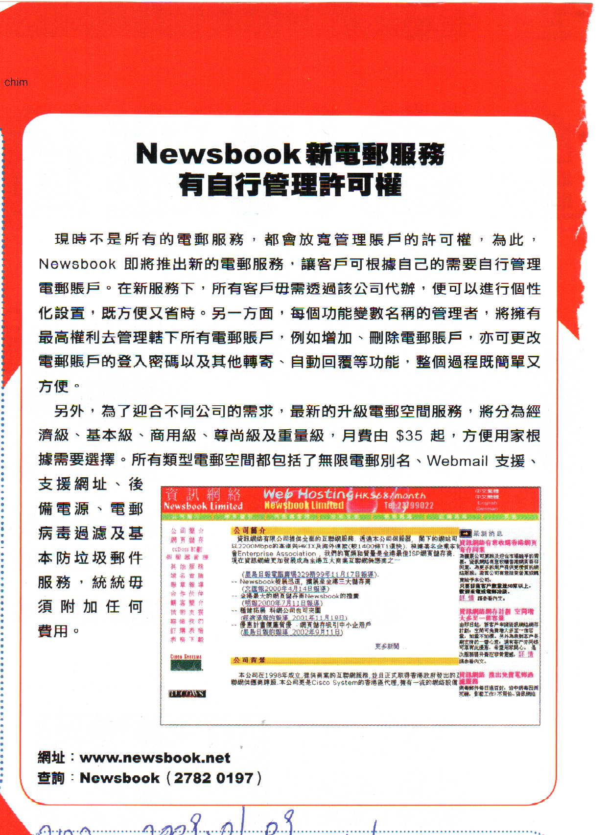 Newsbook comprehensive upgrade E-mail space services, diversification services of economic plan, the basic plan, business plan, premium plan and the heavyweight plan. Customers can freely choose according to their own circumstances. Economic plan and the basic plan are for personal using, just only a monthly fee bottom on HK$35. Both are affordable and convenient. Business-plan only $ 88 a month you can have 20 e-mail. If customer needs more E-mail space, Premier plan, heavyweight plan can let you have from 10 to 20GB of email space, only a monthly fee from HK$288. All types E-mail space including unlimited e-mail alias, Webmail support, Web site support, back-up power supply, e-mail virus filtering and a basic anti-spam services, all without any set up costs! In this service plans, e-mail space diversity, increases the volume will not increase very attractive discount! Newsbook e-mail server is the best choice for you. Hurry up to apply for an account.