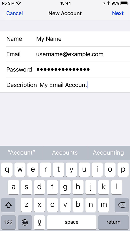Enter username@example.com in the Email field (replace username@example.com with your actual email address).