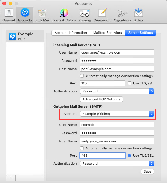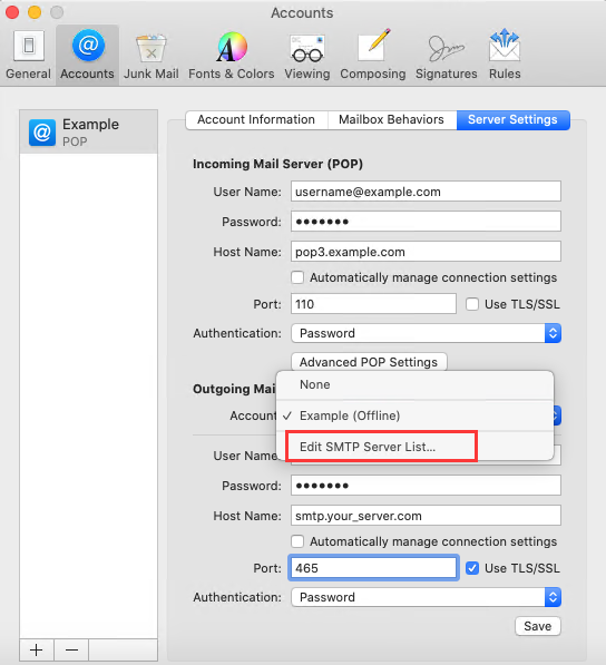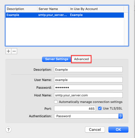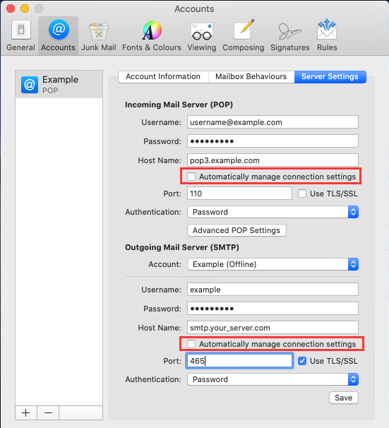 "Username" in "Outgoing Mail Server" should be entered the smtp user name, retype the smtp password, uncheck "Automatically manage connection settings",set its port as 465,Authentication is Password.