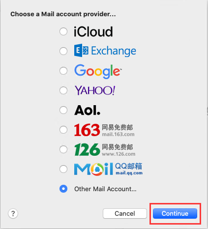 03 Click the radio button next to "Other Mail Account¡K" then select "Continue".