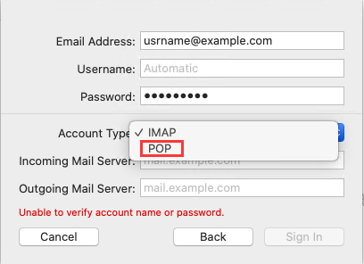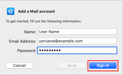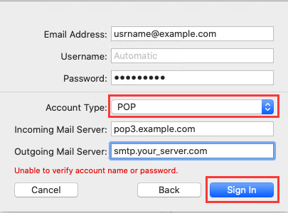 04 In the next panel, Add a Mail account, enter your Name, Email Address and POP3 account password. Then, click Sign In. Apple Mail will attempt to automatically retrieve your email server details.