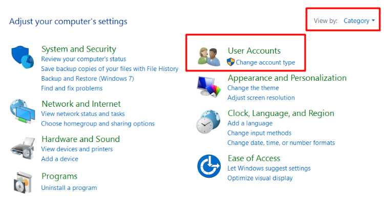 02 Make sure the control panel is viewed by "Category", Firstly click "User Accounts", and Secondly click "Mail¡]Microsoft Outlook 2016¡^".